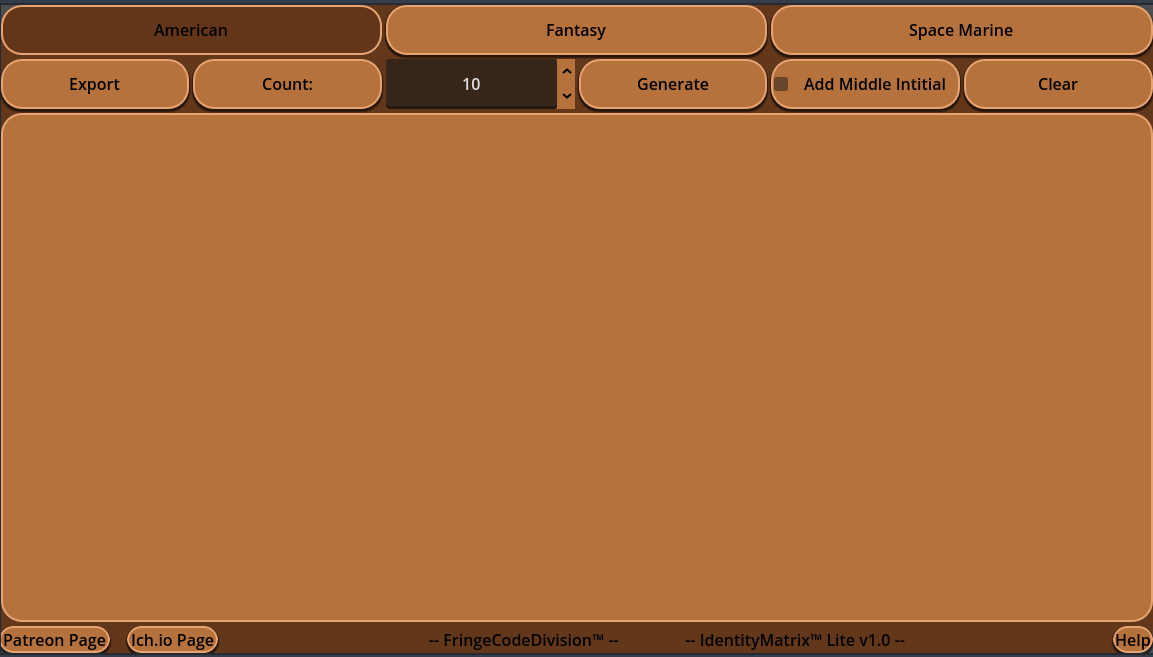 IdentityMatrix™ Lite Brought to you by FringeCodeDivision™ is a compact name-generation tool designed to quickly produce clean, usable identities for characters, NPCs, prototypes, or worldbuilding workflows. It was built to be lightweight, fast, and easy to integrate into any creative process, whether you’re working on games, TTRPGs, writing, or rapid prototyping.